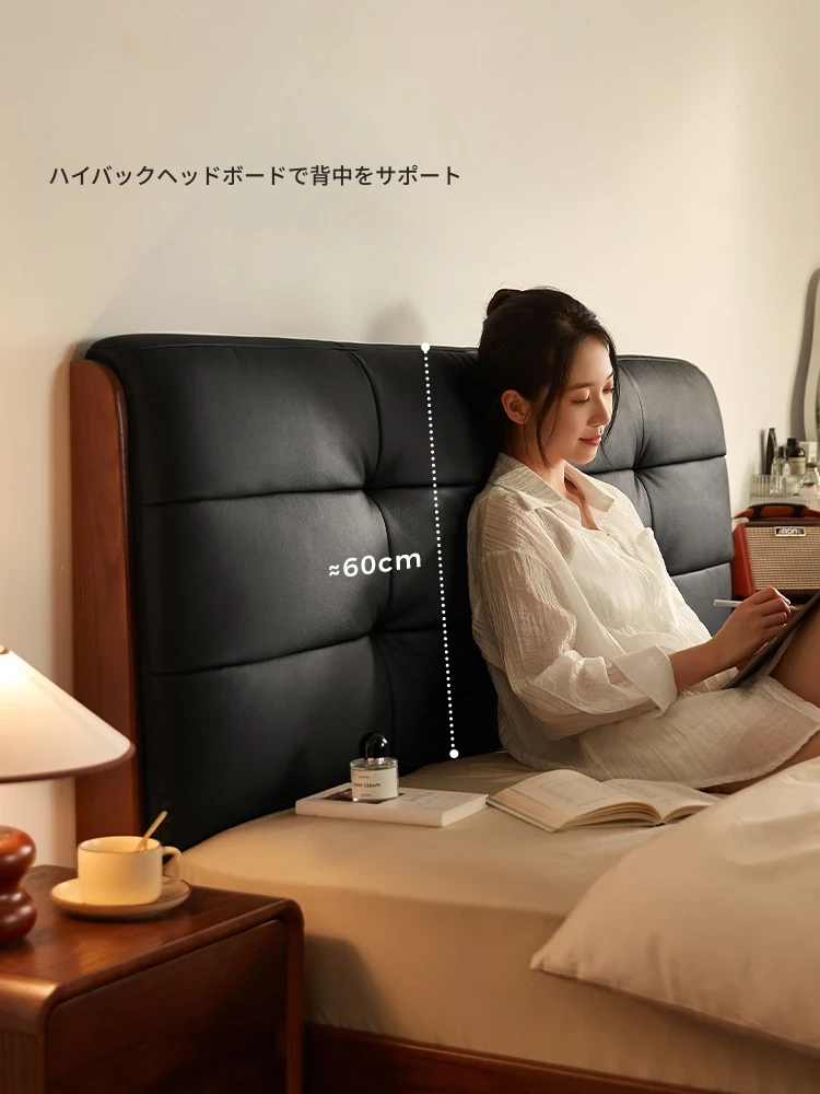 リンシー家具 モダンシンプル 本革ダブルベッド 主寝室用 高級感あふれる無垢フレーム 高箱ストレージ付き 大容量の収納スペースを提供します!リンシー木業のこだわりの逸品。