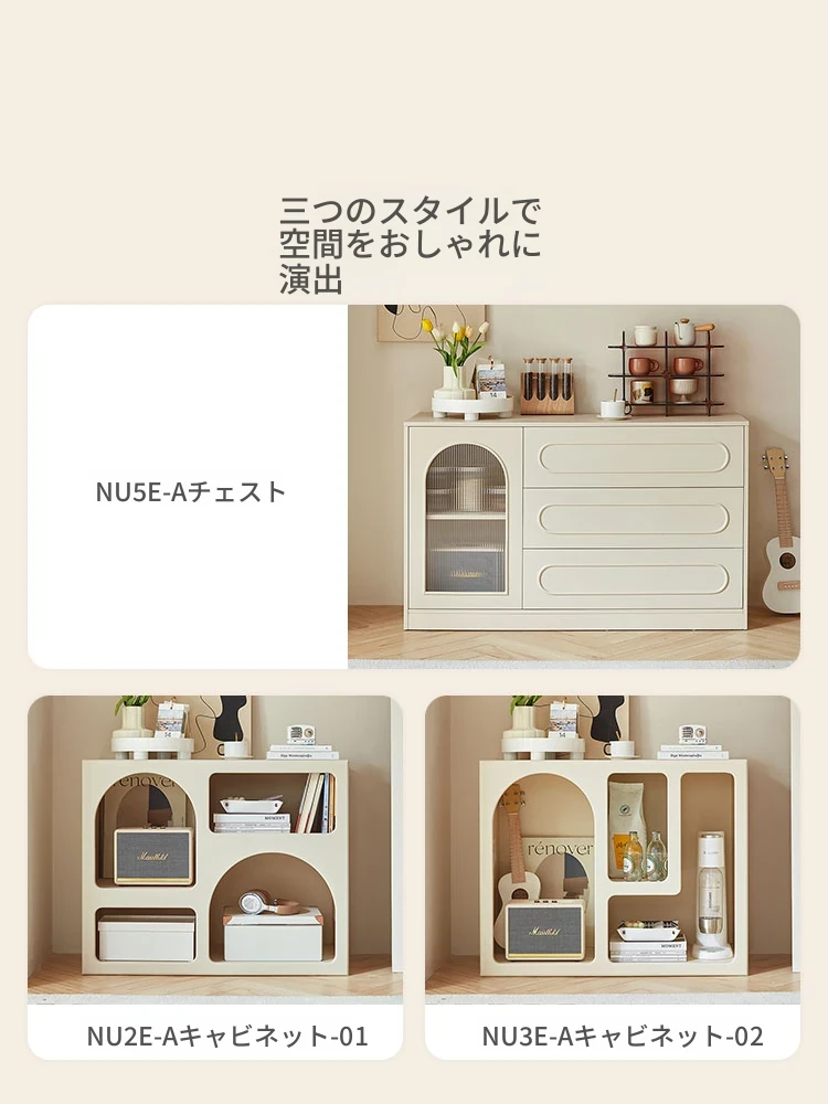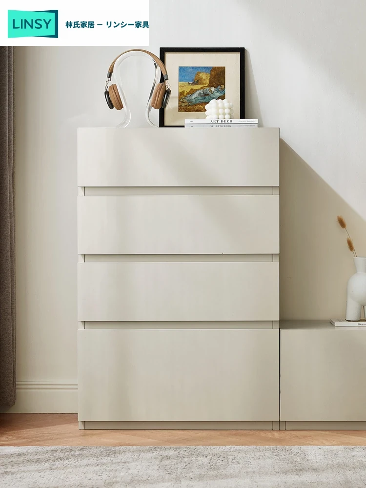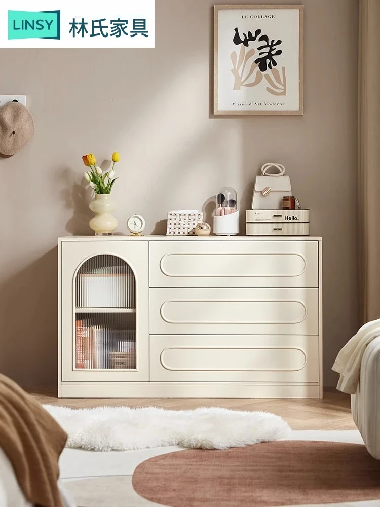 リンシー家具クリームカラーリビングルーム用3段チェスト、木製ベッドルーム向け背面収納引き出しキャビネット - リンシー製品NU2Eの魅力!おしゃれで機能的な収納を実現するデザインです。