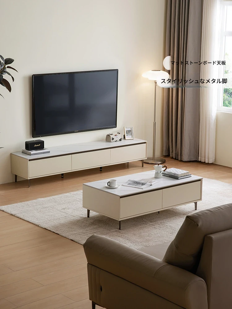 リンシホーム モダンシンプルな2025年新作ローボードとコーヒーテーブルセット - 洗練されたデザインでリビングに最適!耐久性のある石材仕上げ、スタイリッシュな空間を演出。
