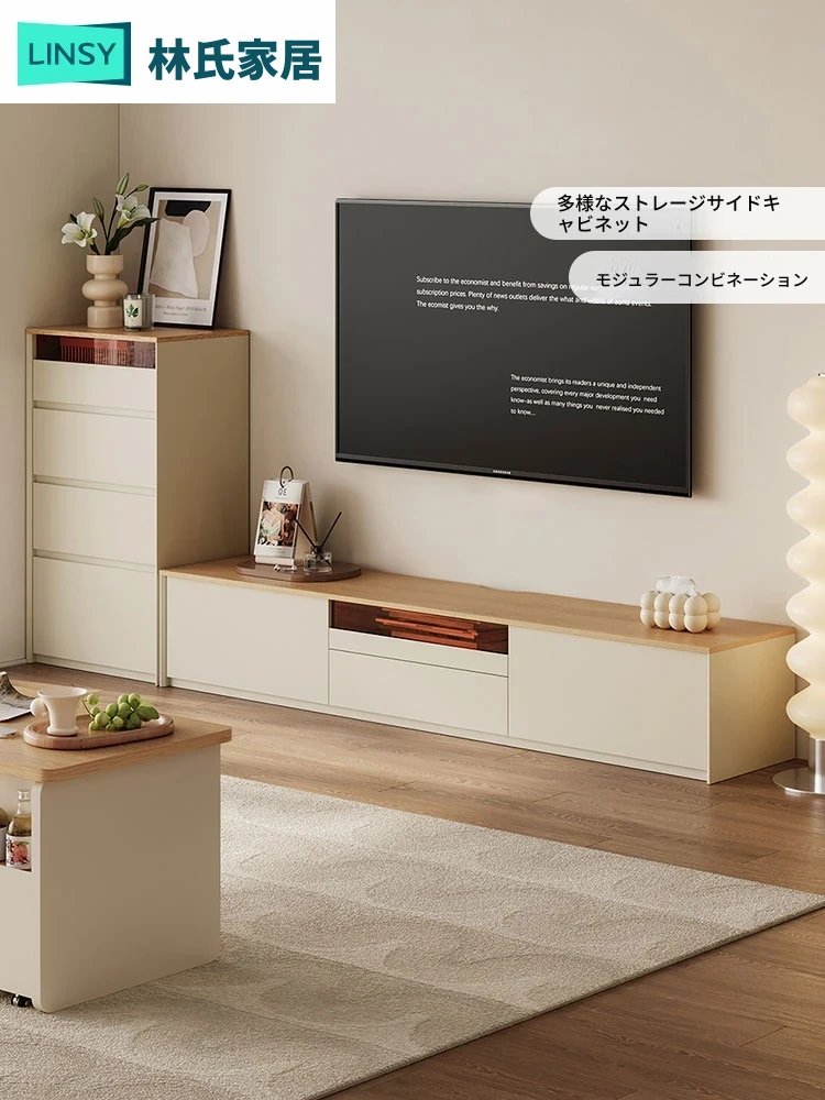 リンシ家居クリーム風デザインテレビ台&コーヒーテーブルセット - おしゃれで機能的なリビングルームに最適なガラス製テレビキャビネット!林氏木業の高品質で優雅なインテリアをお楽しみください。