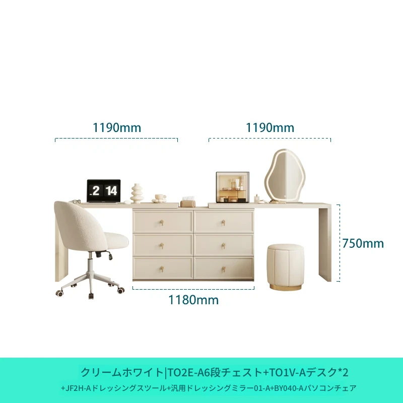 ⑥【伸縮|二人|六斗柜】ドレッサー+ドレッシングスツール+鏡+椅子