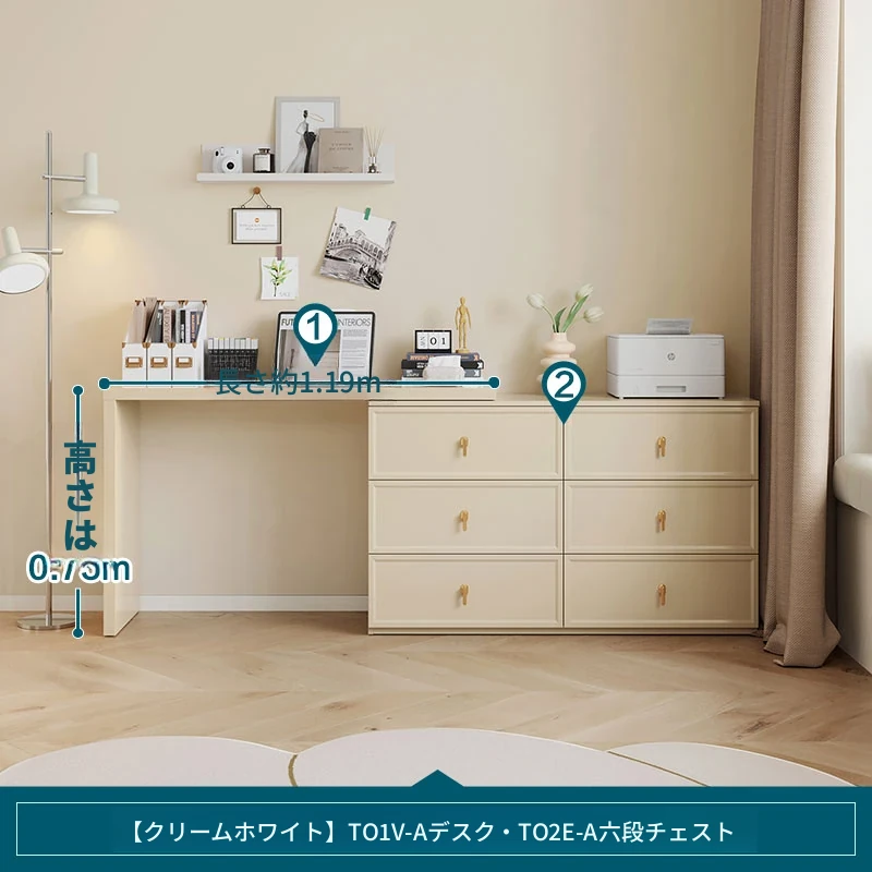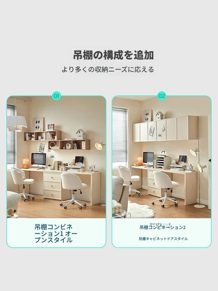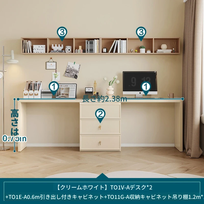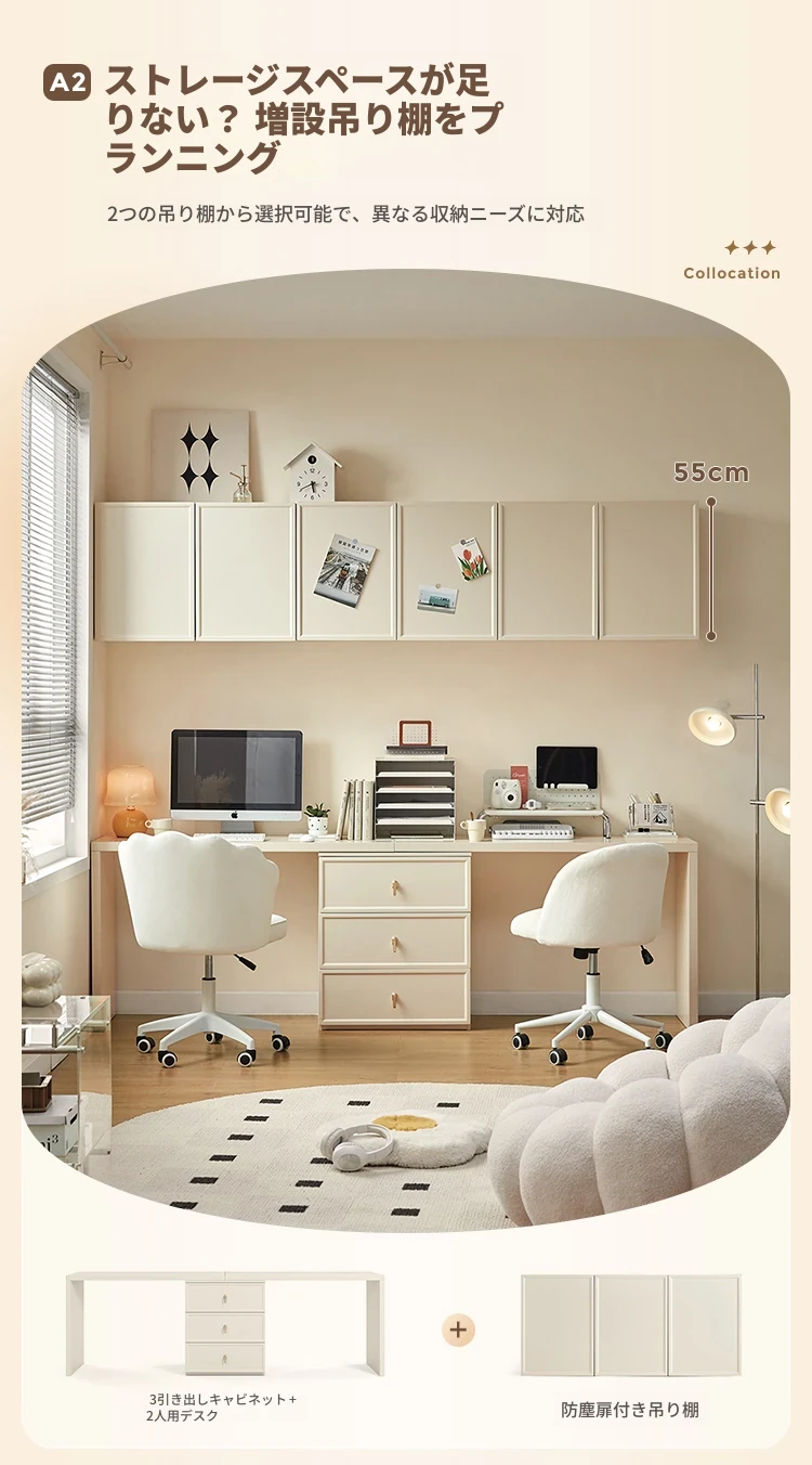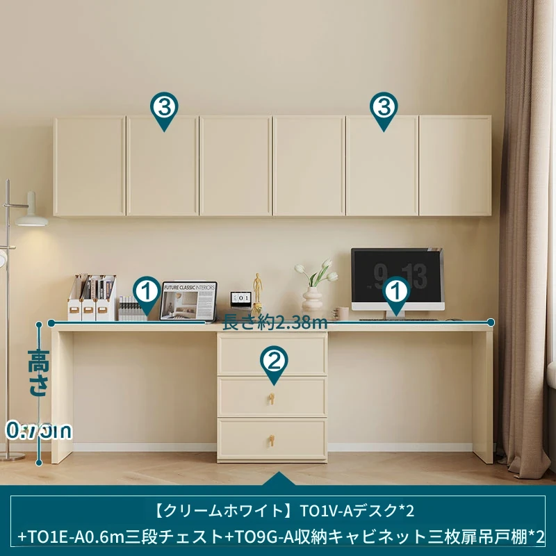 二人伸縮デスク+三斗柜+扉付き吊り棚