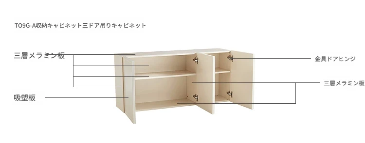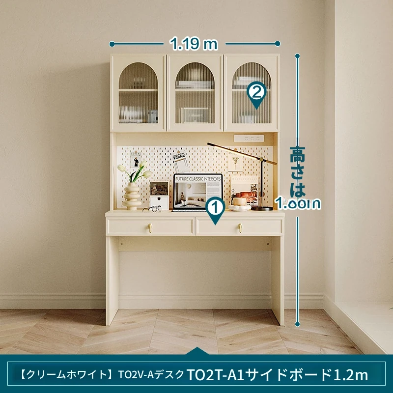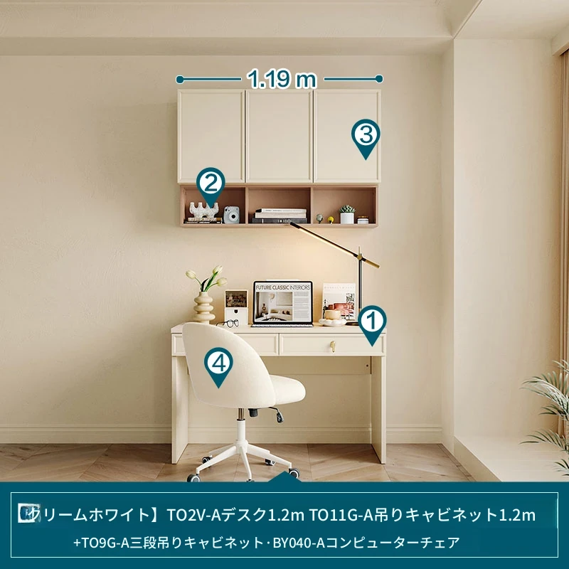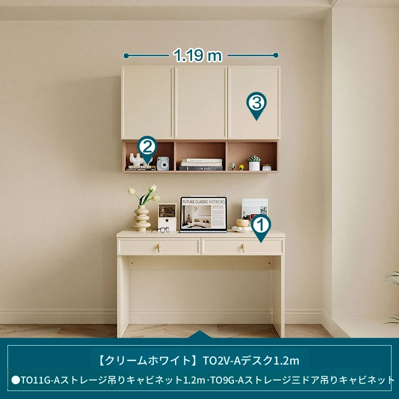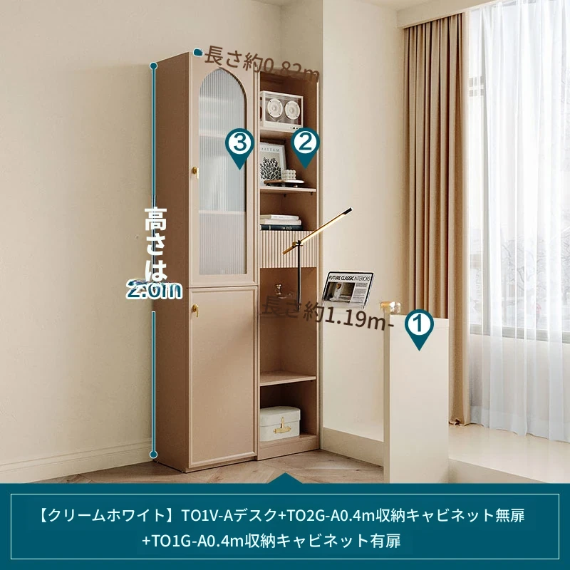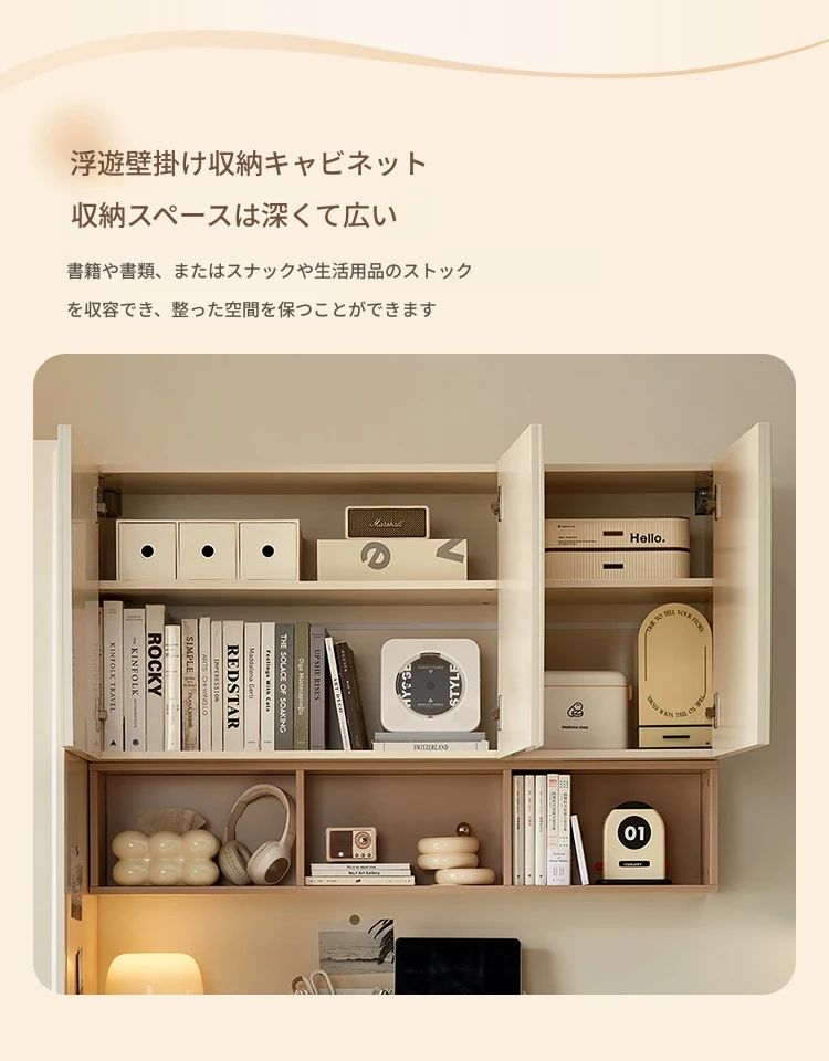 二人伸縮デスク+三斗柜+扉付き吊り棚