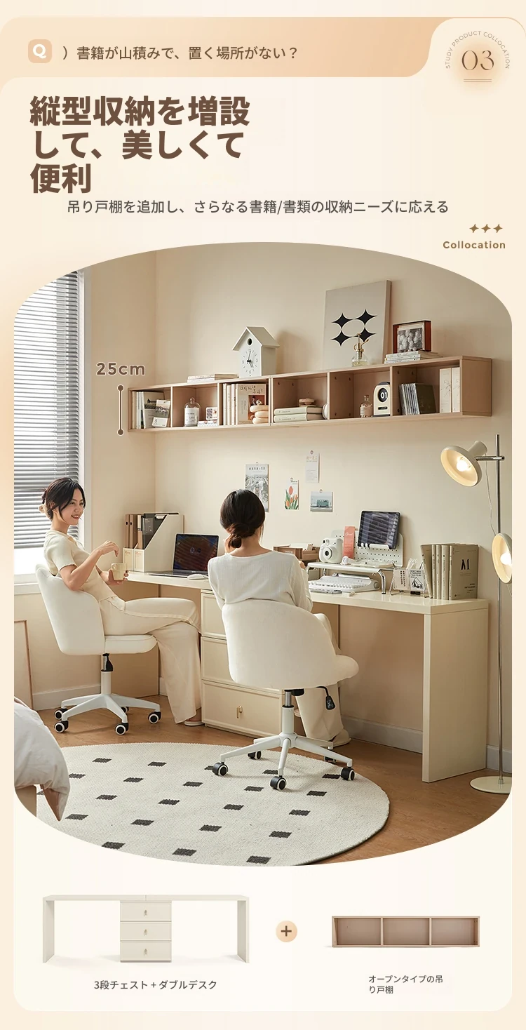 二人伸縮デスク+三斗柜+無扉吊り棚